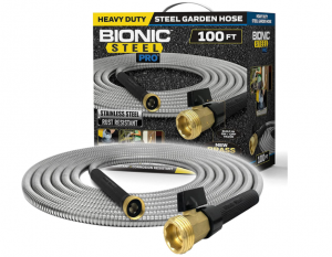 The Bionic steel pro garden hose allows for consistent and steady water flow, even with high-pressure systems. It is fully corrosion and rustproof stainless steel to make sure it will last your year after year. It is built to withstand all kinds of weather conditions from sub-zero to extreme heat it has been proven to cope with it all. We have no worries about recommending this excellent metal garden hose.
