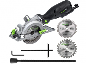 Next, the GALAX PRO Circular Saw is a versatile product that can handle a range of materials. It comes with 6 different blades for several uses, making it more flexible than most saws on the market. The GALAX can cut anything from wood to plastics, with the included adjustment blade for soft metals.